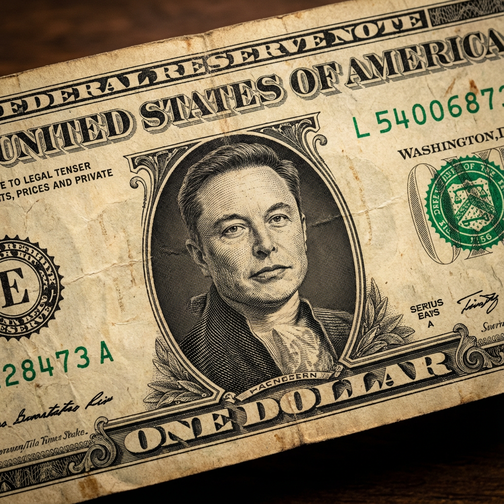 Ultra-realistic U.S. one-dollar bill with Elon Musk as the central engraved portrait, traditional dollar engraving linework, micro-details, authentic paper texture, realistic wear and tear, cinematic lighting, 8K, sharp focus