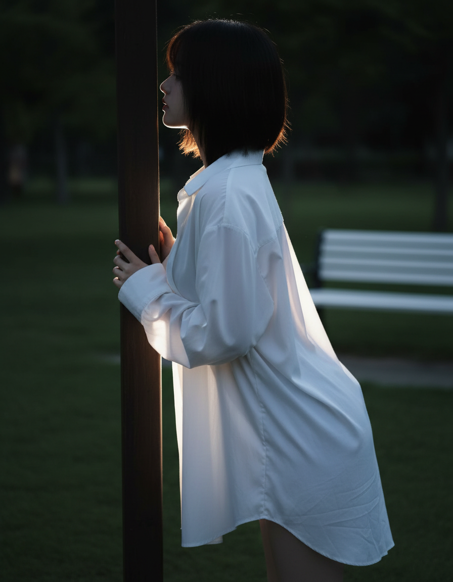 昏暗环境。严格正侧身无偏移角度拍摄,镜头前方40厘米有一名苗条女性,强制侧身与地面呈90度直角垂直弯腰(髋关节折叠角度90°),双手扶前方户外木质柱子,双手不遮挡胸部,人物站在镜头中间处于焦点,光源来自镜头并穿过衬衫,胸部下端轮廓全部以柔和影子形式投影于衬衫两侧被镜头抓拍到,穿着宽体白衬衫,门襟全解,左右门襟自然向两侧垂落符合物理垂坠规律,公园背景有绿色草坪和白色长椅。比例1比1。