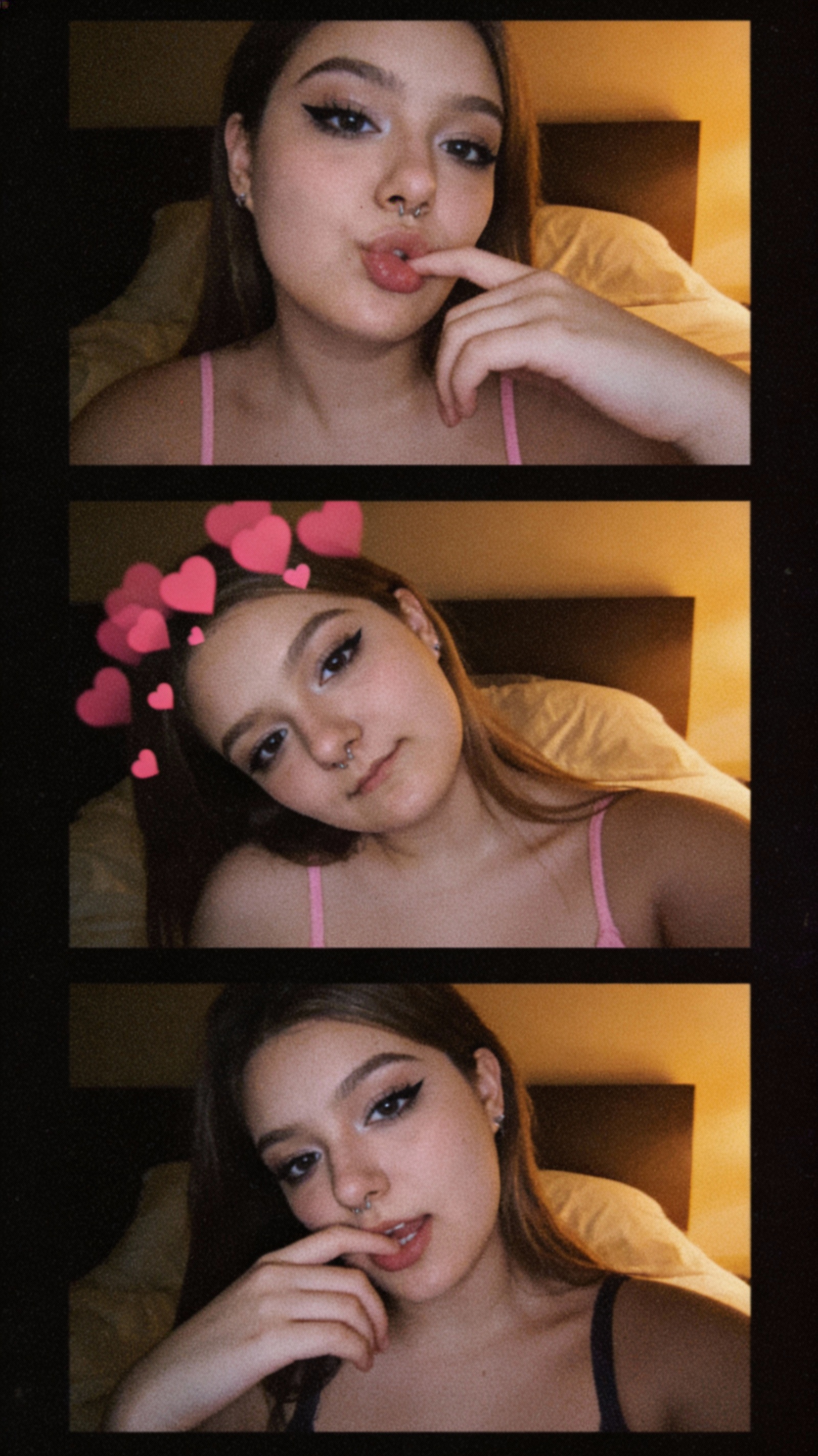 Make a vertical 3-frame low-res webcam collage using my face. Warm dim screen lighting, grainy/ noisy Photo Booth vibe, simple warm bedroom background. Exaggerated pout, finger near lip, pink camisole. Shy/flirty tilt, soft expression, pink hearts overlay. Dramatic late-night pose, darker camisole, hand near mouth. Use my face consistently.