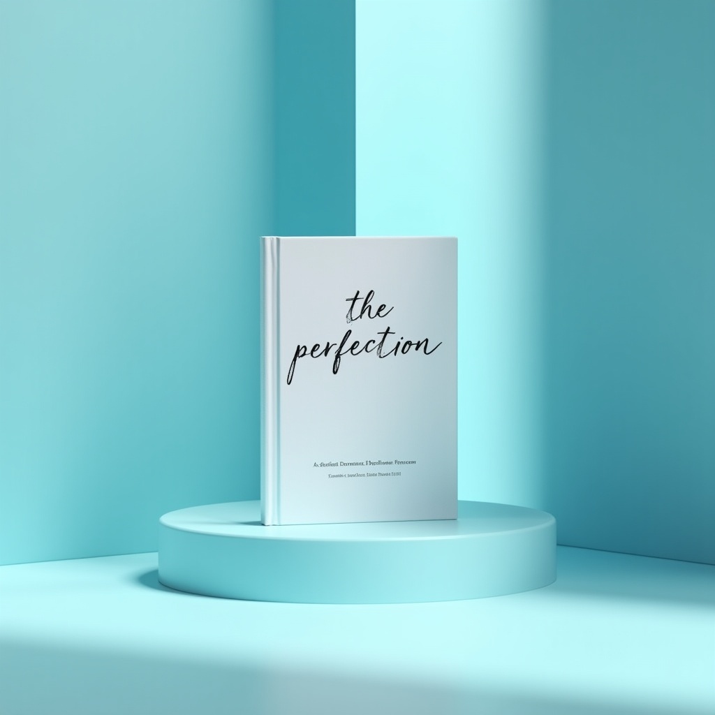 Image de vente professionnelle pour un ebook de développement personnel intitulé « thé perfection ». Mise en scène élégante et inspirante : l’ebook affiché en 3D (mockup réaliste) posé sur une surface douce et lumineuse. Palette de couleurs bleu et turquoise avec dégradés apaisants. Atmosphère calme, moderne et motivante. Éléments visuels subtils évoquant l’acceptation de soi et la perfection imparfaite (formes légèrement irrégulières, lignes dark motivation ). Style minimaliste, premium, haute qualité, format vertical, idéal pour Beacons et réseaux sociaux motivation