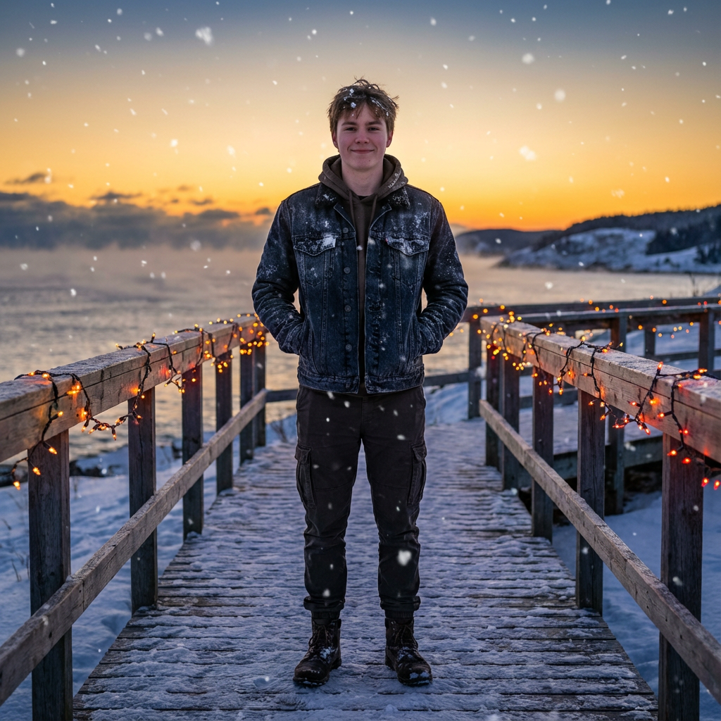 Ultra-realistic editorial portrait of a young person standing alone on an outdoor boardwalk during golden hour, but transformed into a clear winter–Christmas atmosphere. Soft falling snowflakes fill the air, visible against the warm sky. The ocean behind them is slightly misty with cold winter haze. Holiday string lights run along the railings, softly glowing. The subject stands centered, full body, hands in pockets, relaxed posture, confident expression. Their outfit remains casual streetwear but lightly frosted with snow, hair gently moved by cold wind. High-resolution lens, sharp focus on the subject, shallow depth of field separating them from the background. Soft Christmas warmth: faint warm light reflecting on snow, subtle bokeh from holiday lights. Cinematic tone, clean shadows, crisp textures on clothing.