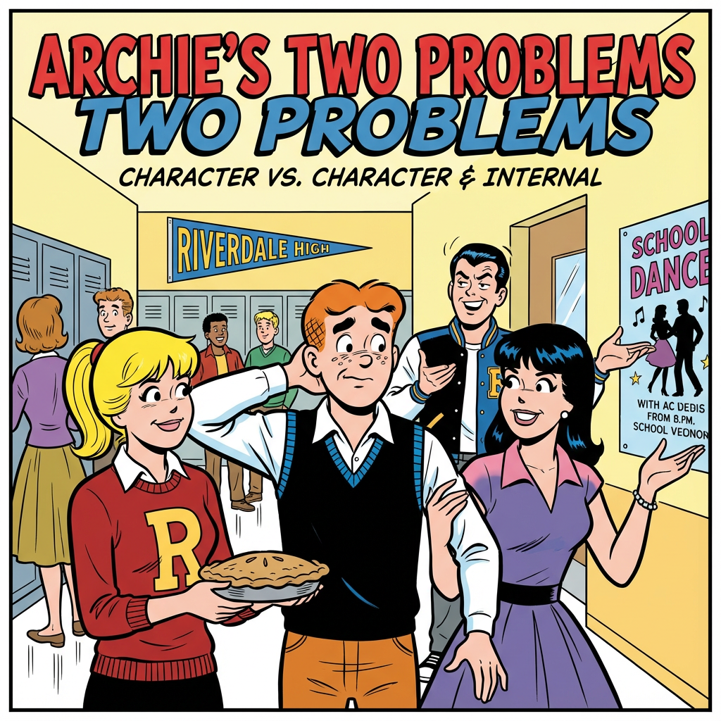 i want an image for this With a focus on the well-known love triangle, the story conflict type of the famous Archie comic "Two Problems" is mainly character vs. character and internal (character vs. self). The rivalry between the two females as they compete for his love is fueled by Archie's emotional struggle to decide between Betty Cooper and Veronica Lodge, the two primary female stars. Reggie Mantle, who regularly vies with Archie for Betty and Veronica's attention, is another source of character-versus-character conflict. These "problems" result in the usual humorous mistakes and miscommunications that characterize the series; the conflict is lighter and resolved within the course of the story.in story conflict type based on archie two problems but without speech bubbles