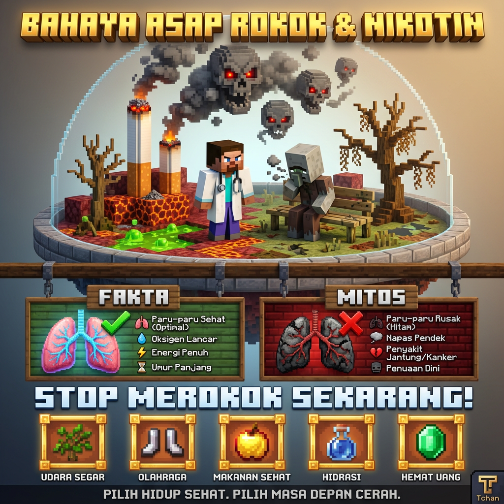 A high-fidelity 3D Minecraft-style infographic poster, voxel art rendered with ray-tracing lighting. **HEADER:** At the top, large, blocky, 3D golden text reads: "BAHAYA ASAP ROKOK & NIKOTIN". **MAIN SCENE:** A central circular diorama shows a corrupted Minecraft landscape. Giant, burning cigarettes act as industrial chimneys, belching thick dark grey smoke that forms pixelated skulls. The ground is Nether-rack and toxic green sludge with dead trees. A blocky character, "Steve" dressed as a doctor in a white coat, looks concerned next to a grey, sickly "Villager" coughing on a wooden bench. **MIDDLE COMPARISON SECTION:** Two hanging wooden signboards side-by-side. **Left Panel (Green Wood background):** Title text "FAKTA". Below is a 3D model of healthy pink pixelated lungs with a green checkmark. Bullet points text: "Paru-paru Sehat (Optimal)", "Oksigen Lancar", "Energi Penuh", "Umur Panjang". **Right Panel (Red Nether Brick background):** Title text "MITOS". Below is a 3D model of damaged, black pixelated lungs with a red X mark. Bullet points text: "Paru-paru Rusak (Hitam)", "Napas Pendek", "Penyakit Jantung/Kanker", "Penuaan Dini". **FOOTER SECTION:** Large white blocky text spanning the width reads: "STOP MEROKOK SEKARANG!". Below that, a row of five golden Minecraft item frames containing 3D items with small white text labels underneath each: 1. Tree Sapling item, label reads: "UDARA SEGAR" 2. Iron Boots item, label reads: "OLAHRAGA" 3. Red Apple item, label reads: "MAKANAN SEHAT" 4. Blue Water Potion bottle item, label reads: "HIDRASI" 5. Green Emerald item, label reads: "HEMAT UANG" **VERY BOTTOM:** Small text line at the very bottom edge reads: "PILIH HIDUP SEHAT. PILIH MASA DEPAN CERAH." with a small Tchan logo in the corner.