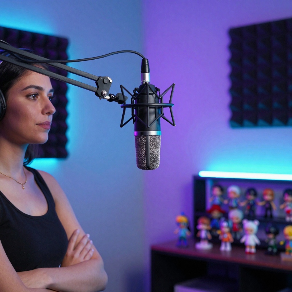 A professional broadcast microphone on a boom arm is positioned near her, with a subtle reflection of her face visible on its polished metal surface. Behind her, customizable LED light strips shift between soft blue, violet, and cyan tones, casting vibrant gradients across sound-dampening panels and a neatly arranged shelf of collectible figures.