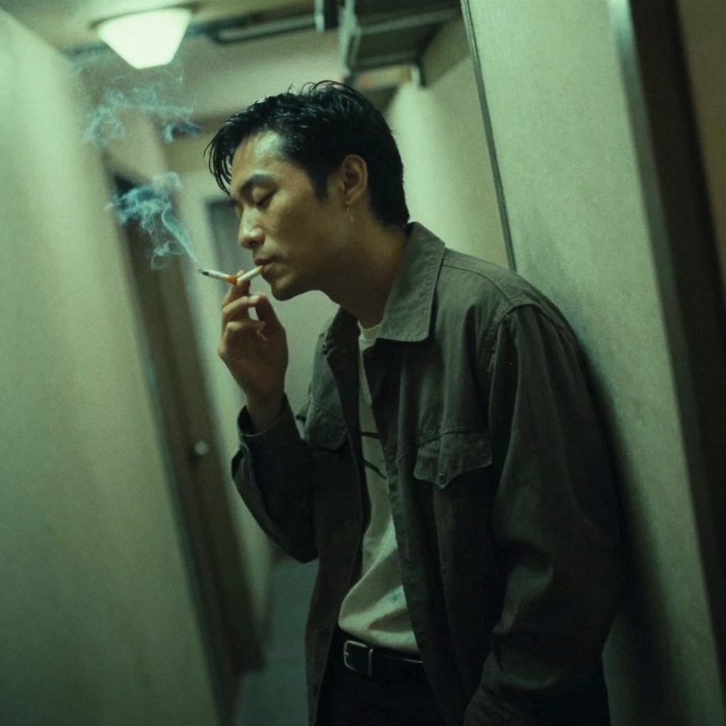 Wong Kar-wai film style, a lonely man smoking a cigarette in a narrow Hong Kong hallway, 1990s. Greenish fluorescent lighting, heavy shadows, moody atmosphere. Slight motion blur to create a dreamlike quality. Film grain, vignetting, emotional, cinematic composition, dutch angle shot.