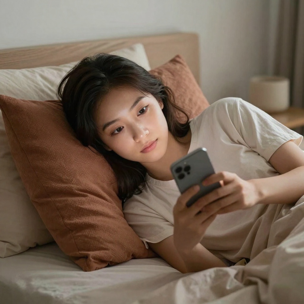 A beautiful young woman in her early 20s lying comfortably on her bed in a softly lit modern bedroom. She has gentle, relaxed features, medium-length dark hair loosely tousled, and warm brown eyes illuminated by the soft glow of her smartphone screen as she scrolls through it. She is partially propped up against a pair of large, textured throw pillows in muted earth tones — terracotta, charcoal, and cream.