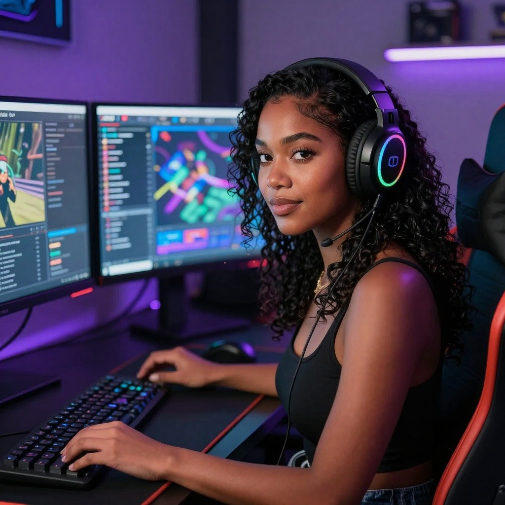 A beautiful young woman with smooth caramel-toned skin and expressive dark eyes sits at her sleek gaming desk in a modern, high-end streaming room designed for Twitch broadcasting. She wears premium over-ear RGB headphones pushed slightly back on her long curly black hair. Her face is softly illuminated by the glow of dual curved monitors displaying a live chat feed, OBS overlays, and colorful gameplay elements.